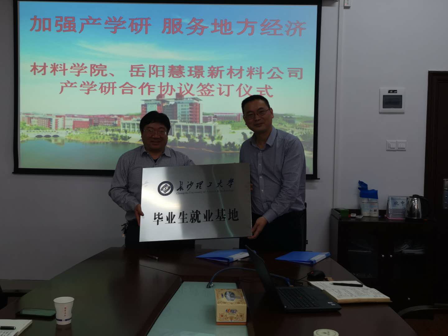 会后,学院还与岳阳慧璟新材料科技有限公司签订了毕业生就业基地协议,并授牌。