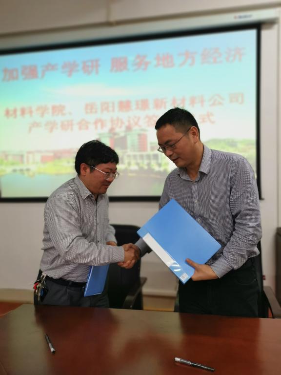 4月19日,在新能源大楼1号楼317会议室举行了材料学院与岳阳慧璟新材料科技有限公司校企合作的签约仪式。岳阳慧璟新材料科技有限公司总经理邹凌峰、校科技成果转移转化中心副主任李岳林、材料学院党总支书记张国强、副院长杨现锋、教授晁自胜出席了签约仪式。