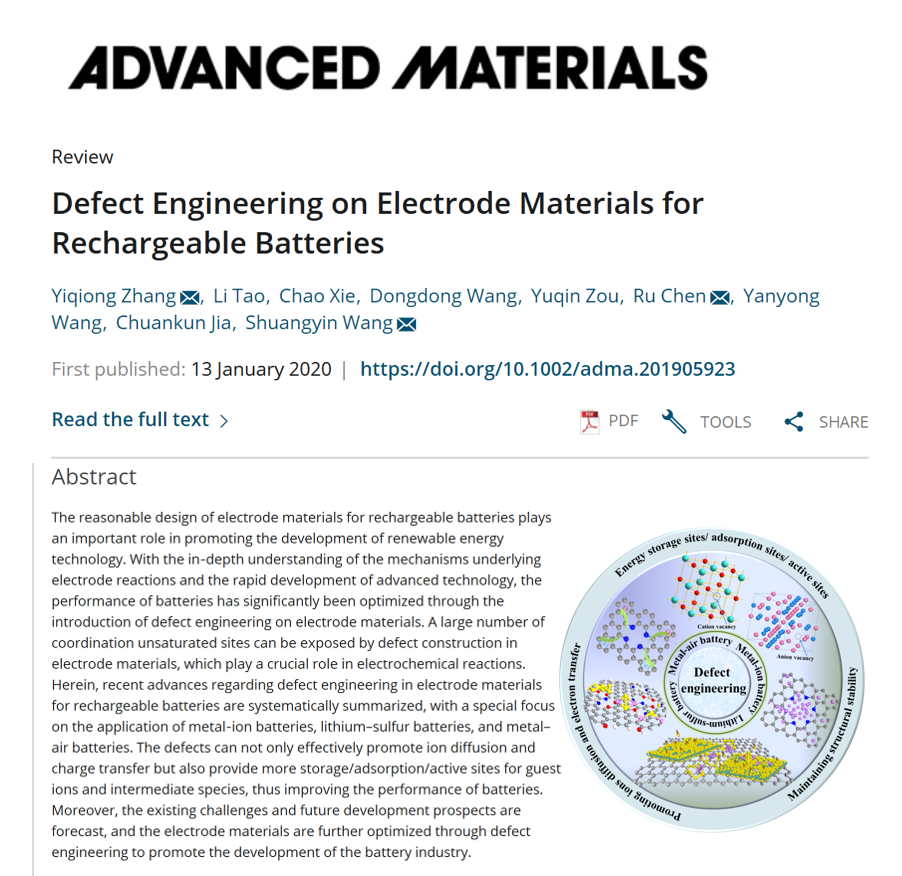 近日,我校材料科学与工程学院张怡琼博士与湖南大学王双印教授一起合作,以第一作者与通讯作者在国际顶级期刊Advanced Materials(《先进材料》,IF=25.809)上发表题为“Defect Engineering on Electrode Materials for Rechargeable Batteries”的综述论文。