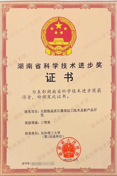 近日,湖南省科技创新奖励大会在长沙召开,由我院谢炜教授科研团队主持完成的“天然隐晶质石墨深加工技术及新产品开发”荣获2021年度湖南省科学技术进步奖三等奖。