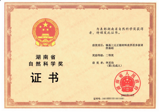 近日,湖南省科技创新奖励大会在长沙召开,由我院李灵均教授科研团队牵头完成的“镍基三元正极材料表界面多级调控基础”荣获2021年度湖南省自然科学奖二等奖。