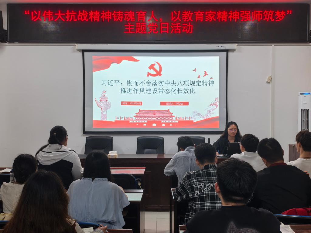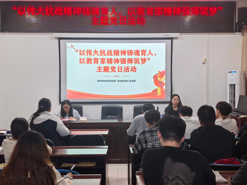 材料科学与工程学院本科学生党支部于925日晚在新能源大楼1908会议室开展以伟大抗战精神铸魂育人,以教育家精神强师筑梦主题党日活动。活动由党员汤锦妍主持。