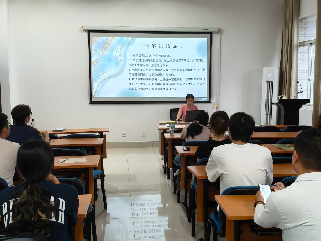 会议伊始,主持人陈诗骞首先阐述了本次会议的目的,即围绕上学期工作中出现的查课不够细致、请假流程不规范等问题进行统一说明,旨在进一步加强学风建设,引导学生端正学习态度。她详细解读了学习委员的各项核心职责,并针对工作中常见的难点提出了具体的改进建议。