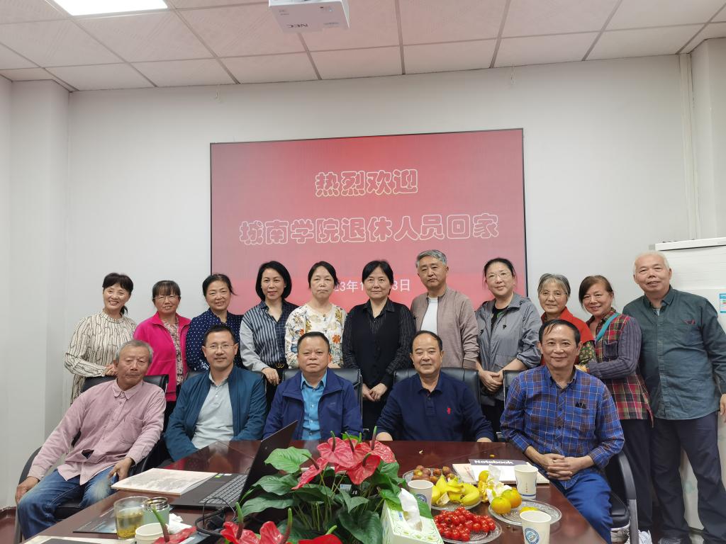 1023日,城南学院召开退休教职工座谈会,热烈欢迎退休人员回家,院长赵华、副院长兼工会主席朱广峰以及院党务部、办公室工作人员及14名城南学院退休自助组人员参加座谈。