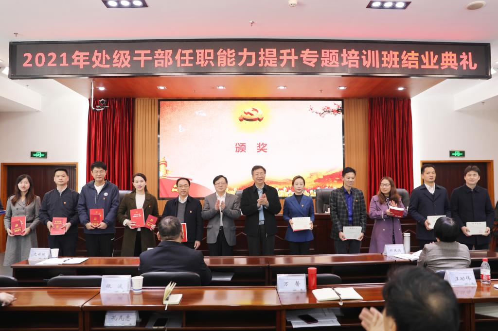 11月30日下午,学校在一办九会议室举行2021年处级干部任职能力专题培训班结业典礼。校党委书记付宏渊、党委副书记刘建民出席。结业典礼由党委组织部副部长、党校副校长靳攀科主持。