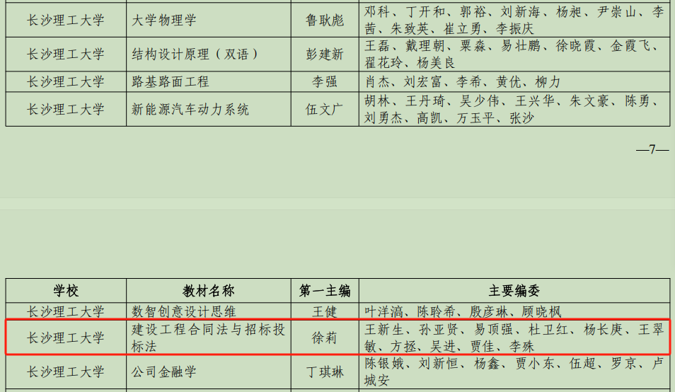近日,湖南省教育厅正式发文公布2025年普通高等学校数字化教材拟立项建设名单,我院徐莉教授牵头工程法教学团队编写的《建设工程合同法与招标投标法》教材成功入选。作为本次我校省级数字化教材建设立项的7本教材之一,实现了我院在省级教材建设领域的历史性突破,可喜可贺!