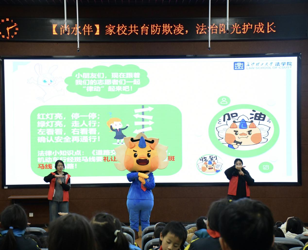 交通安全课堂则化身为互动乐园。法学院吉祥物“法小理”惊喜亮相,瞬间成为全场焦点。在它的带领下,同学们共同学习安全通行手势操,伴随着“红灯亮,停一停;绿灯亮,走人行”的清脆口诀,一举一动中牢记安全规范。随后的情景判断环节,模拟了“开门下车”“过马路”等真实生活场景,同学们踊跃参与,在问答与思考中将安全知识内化于心。现场气氛热烈,笑声与掌声不断。