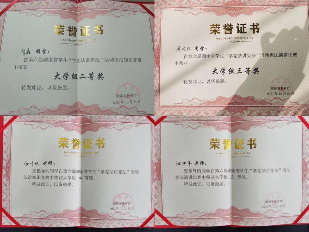 为进一步推动大中小学校广泛深入地开展以宪法教育为重点的青少年法治教育,进一步增强学生宪法意识,大力弘扬宪法精神,切实维护宪法权威。10月23日至24日由湖南省教育厅主办的届全国学生“学宪法讲宪法”活动湖南赛区总决赛在湘潭大学举行。法学院20级学生付鑫、周凤仪经过初赛层层比拼,代表学校分别晋级演讲和知识竞赛决赛。
