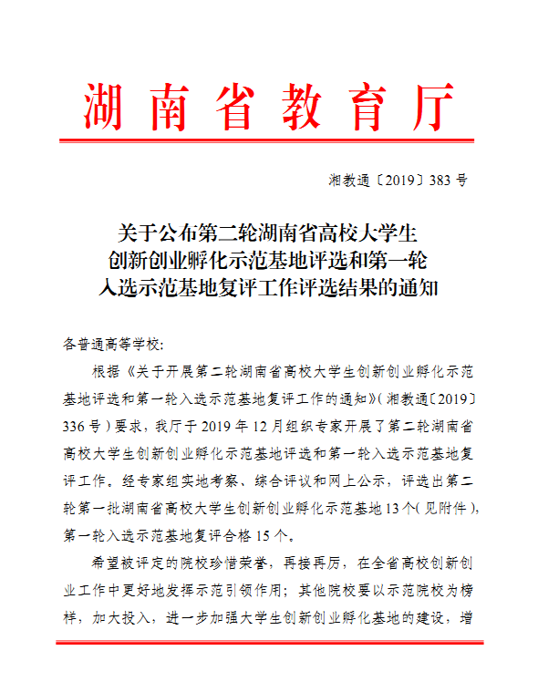 省教育厅于 2019 年 12 月组织专家对全省高校开展了第二轮湖南省高校大学生创新创业孵化示范基地评选和第一轮入选示范基地复评工作。经专家组实地考察、综合评议和网上公示,我校大学生创新创业园被复评为湖南省高校大学生创新创业孵化示范基地。