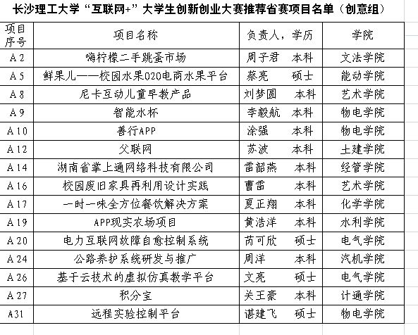 我校于9月2日晚组织了“互联网+”大学生创新创业大赛校级比赛,经专家评委、助理评委共同评分,经研究决定推荐以上15个创意类项目,6个实践类项目参加省项,具体名单如下,请各学院及项目负责人按照《关于“乐易考杯”湖南省“互联网+”大学生创新创业大赛全省复赛有关事项的通知》的要求做好相应赛事准备工作,争取优秀成绩!