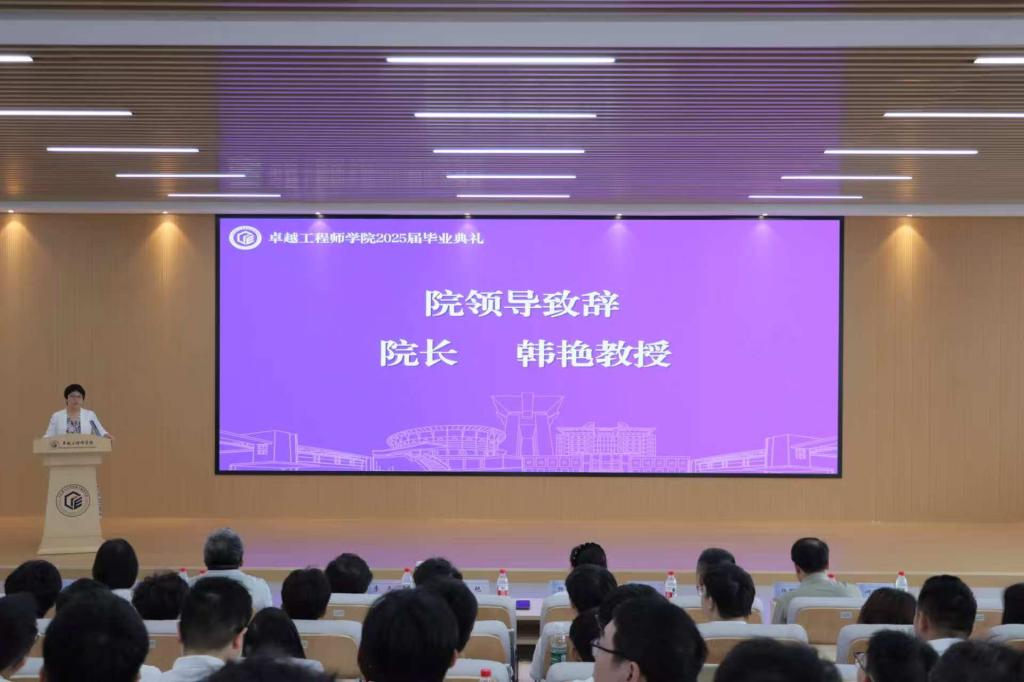 典礼伊始,学院院长韩艳教授致欢送词。她向毕业生表示祝贺,回顾学子四年成长,并提出三点寄语:让“学习”成为终身习惯,以知识应对时代挑战;让“实干”成为鲜明标签,在实践中锤炼工程师本领;让“修身”成为前行基石,以品格支撑理想。