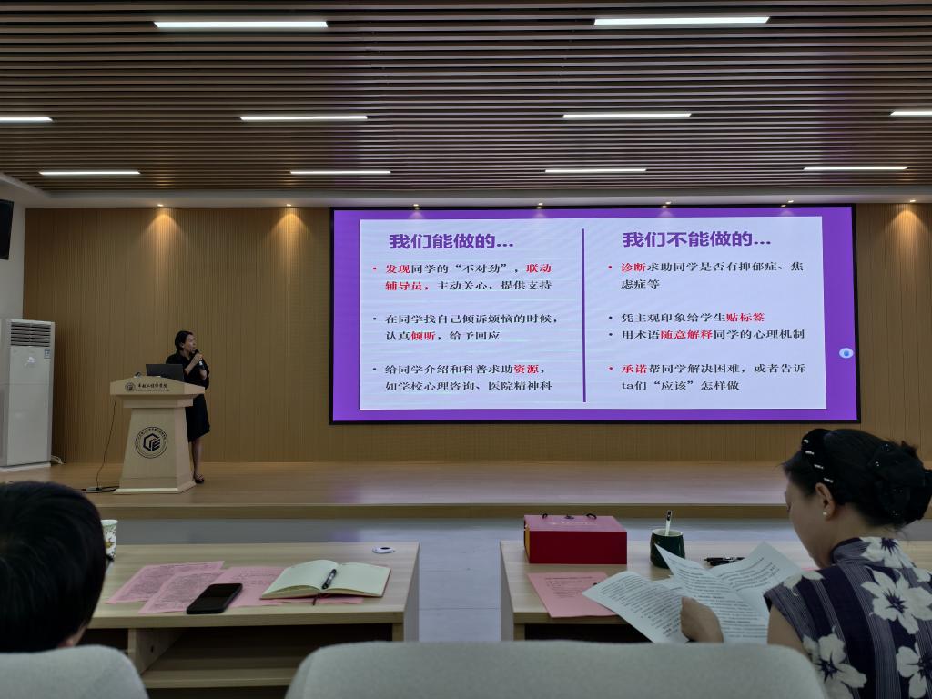 其次,她重点介绍了学校与学院两级完善的心理援助资源体系。详细说明了学校心理健康教育与咨询中心的预约方式、服务范围以及紧急情况下的求助渠道。同时,也向老师们明确了学院层面的支持网络与联动机制,确保每一位导师和班主任都能清晰知晓当学生遇到心理困境时,如何快速、有效地启动校院支持流程,为学生构筑起坚实的心理安全防护网。