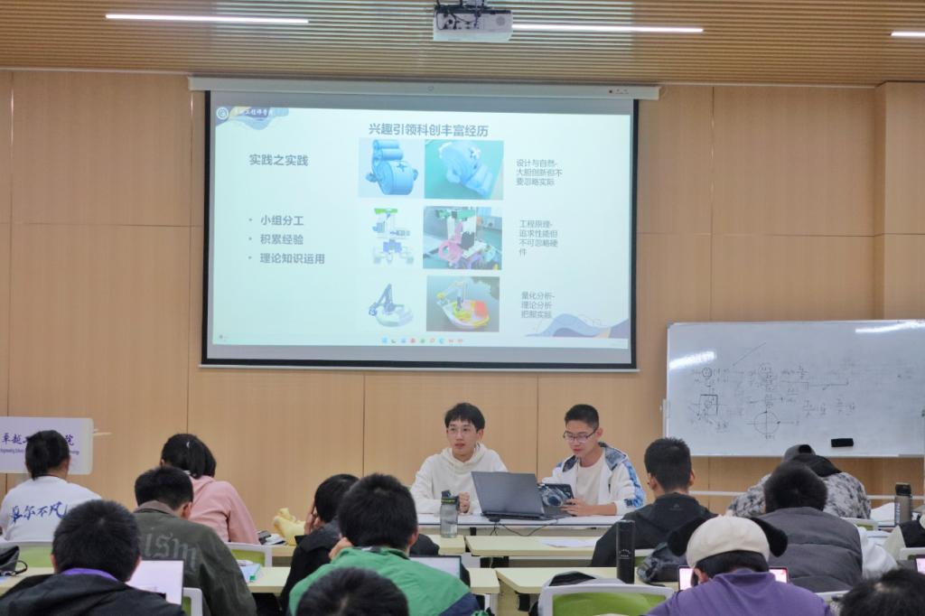 郝一航围绕“设计与自然”课程,分享其独特的设计思路。他建议,产品设计应立足于对成熟产品的深入理解,进行持续性的微小改进与迭代,这种“微创新”路径更符合实际工程研发逻辑。同时,他鼓励同学们积极参加科创训练营和专业讲座,以拓宽视野,激发创新灵感。