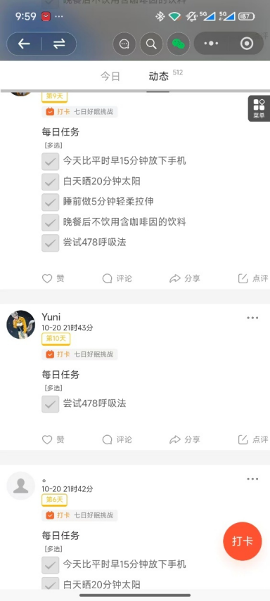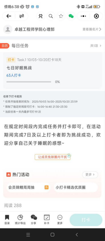活动期间,同学们通过线上平台,在每晚指定时间前记录自己的“入睡准备”,分享阅读、听轻音乐、远离电子设备等有助于睡眠的睡前习惯,以打卡的形式互相监督、彼此鼓励。整个活动不仅是一场简单的作息调整,更是一次关于健康生活方式的集体学习和实践。许多参与同学表示,活动帮助他们重新找回了规律的作息节奏,白天的精神状态和课堂专注力得到了显著提升。