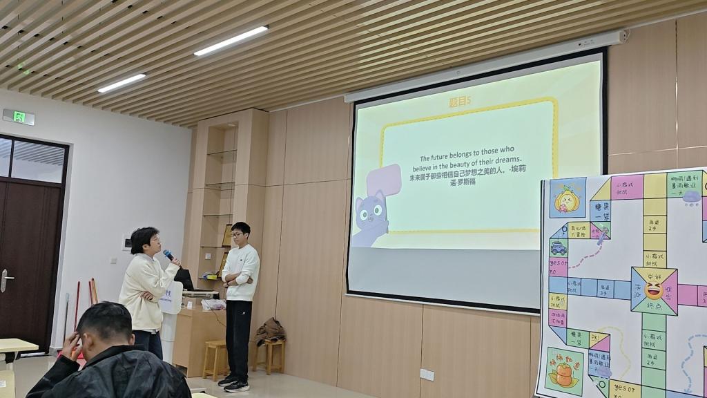 本次活动中,全体新生积极参与。活动设计独具匠心,借鉴“飞行棋”的游戏模式,融入丰富的学业与素质任务。各小组通过投掷骰子决定行动,掷得奇数方可“起飞”,象征勇于迈出探索步伐。行进过程中,队员们需根据点数顺时针前进,并在停留点完成各类挑战任务。任务内容精心设计,紧密围绕新生成长需求,既有“四级词汇抽查”“四级文段朗读”等紧扣学业基础的环节,助力新生提前感知、积极备考大学英语四级;也有“名著经典语句现场朗读”,在感悟语言之美与文化底蕴中提升人文素养;更不乏“小游戏挑战”“小组PK”“才艺展示”等互动项目,以及“获得糖果”等暖心奖励,全面锻炼学生的团队协作、沟通表达与临场应变能力。