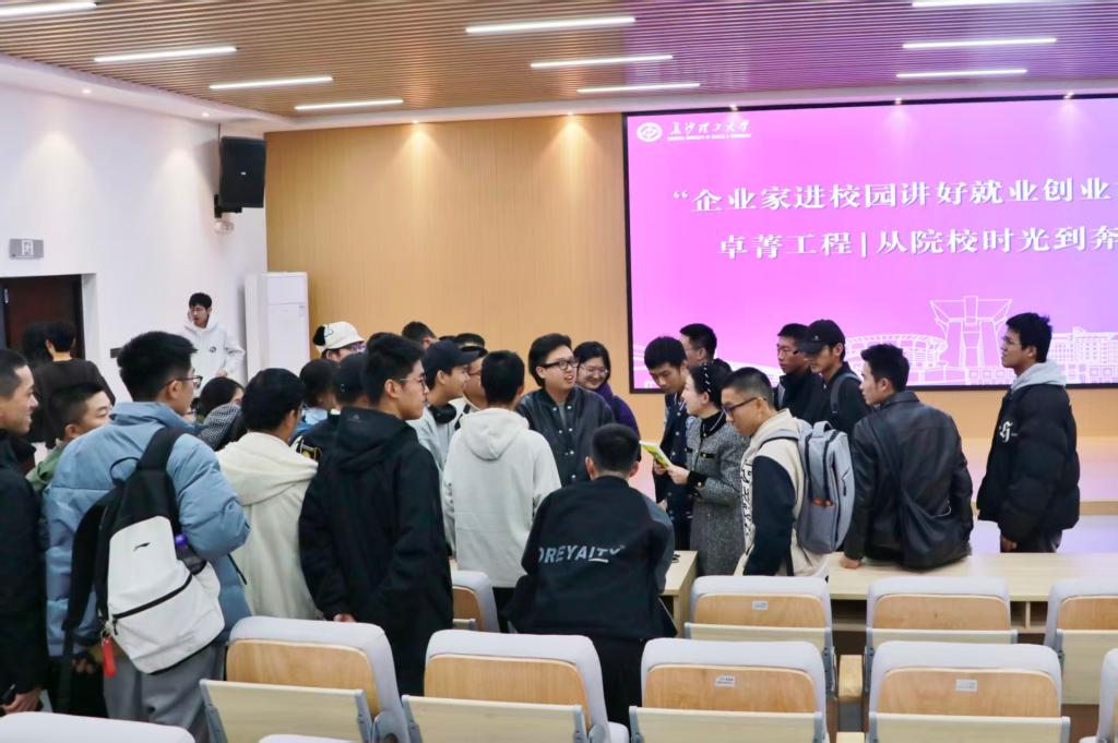 在互动交流环节,与会学生就学业与创业的平衡、市场竞争策略及能力培养等问题踊跃提问,邝烨庆结合自身经验逐一进行回应与解答。