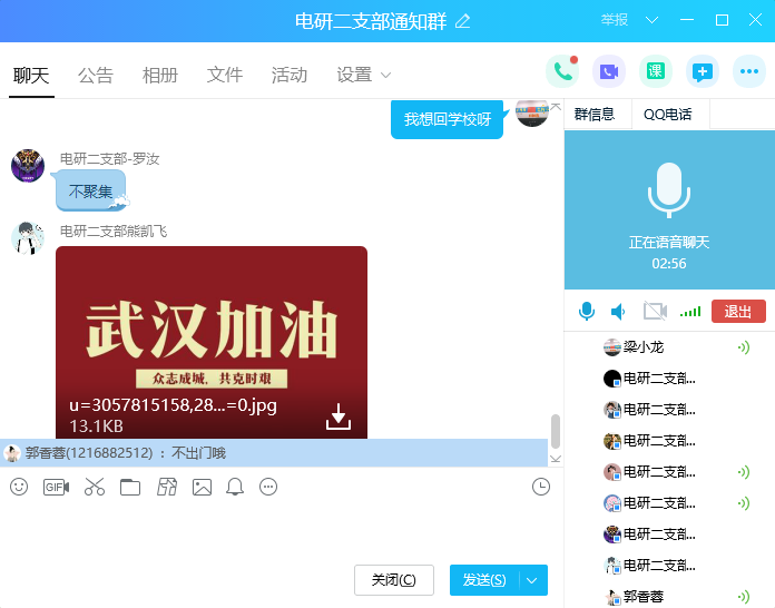 电研二支部成员踊跃发言,积极交流,对疫情期间自身的思想学习状况进行汇报。陈维捷认为大学生党员应主动发挥自身的优势,从小事做起,从身边事做起,不信谣不传谣,不盲目跟风,只从官方媒体获取权威信息。支部书记郭香蓉总结了各位的发言,抗击疫情已经进入了关键的时期,各地区疫情已得到控制,作为学生党员,要做好自己本职工作,不断提高自己各方面的能力与素养,共同为抗击疫情而努力。