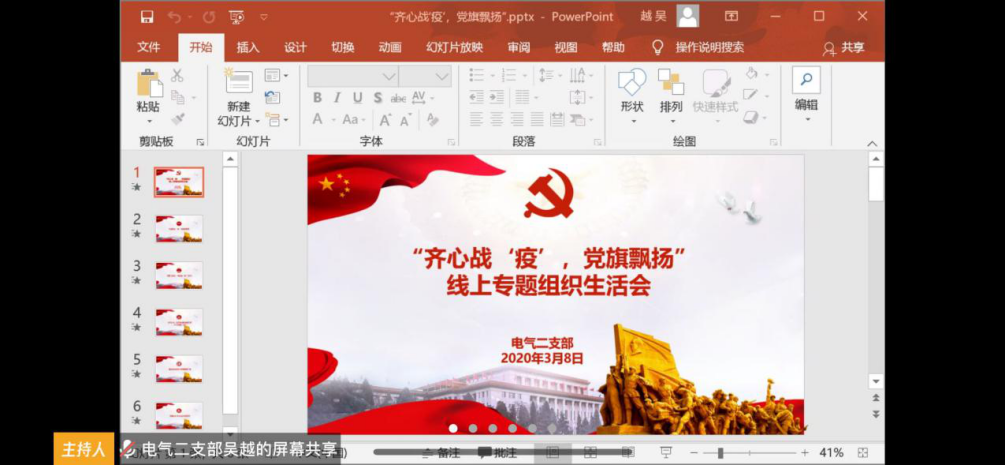 电气二支部成员分享“疫”情真实故事,集体观看《武汉,我的战“疫”日记》短片,分享读电光火时《当前疫情教会我们的六个道理》微推的心得体会。支部书记杨宸君提醒各位党员的参会认真度不要因为形式而受影响。她围绕上学期“不忘初心、牢记使命”主题教育的总要求,提出四个问题,并总结并规划了支部之后的工作学习计划。她强调,支部党员要加强理论学习,注意加强身体的锻炼,利用好自己的时间给自己做好计划。