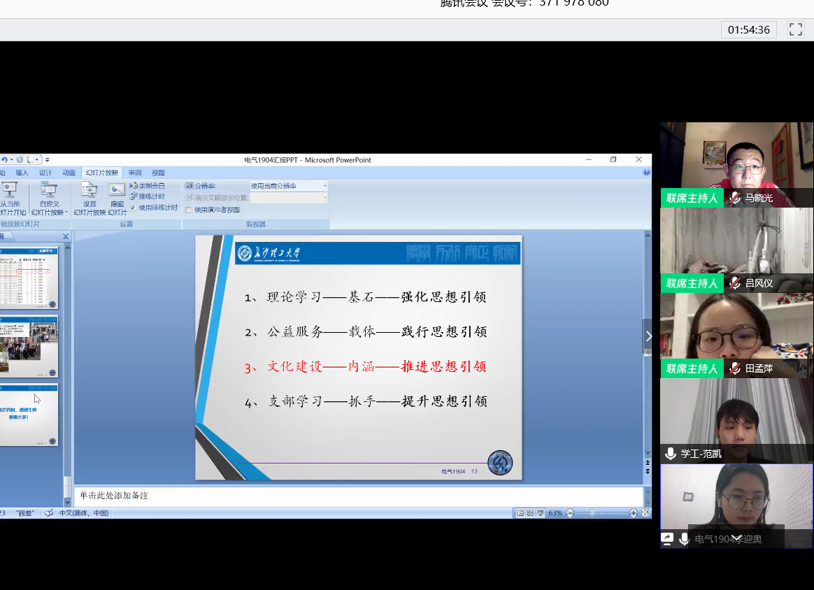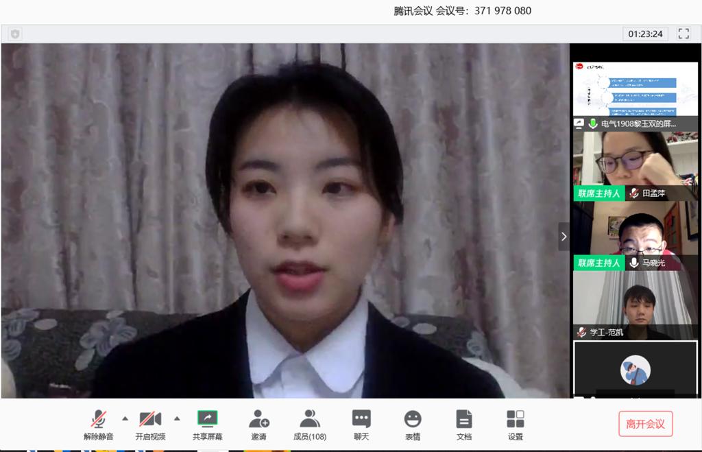 为加强基层团支部建设,增强支部争先创优意识,更好地发挥团支部的先锋模范作用,电气学院于4月9日晚19:00-22:00在腾讯会议应用平台举行2019-2020学年“五四先进团支部”线上答辩会。担任本次云答辩的评委有电气学院团委书记田孟萍、17级辅导员马晓光、19级辅导员范凯、杨宸君以及分团委学生会主席团成员,2017-2019级各班班长团支书及旁听同学近120人参加,此次答辩会由自动化1901班夏思磊主持。