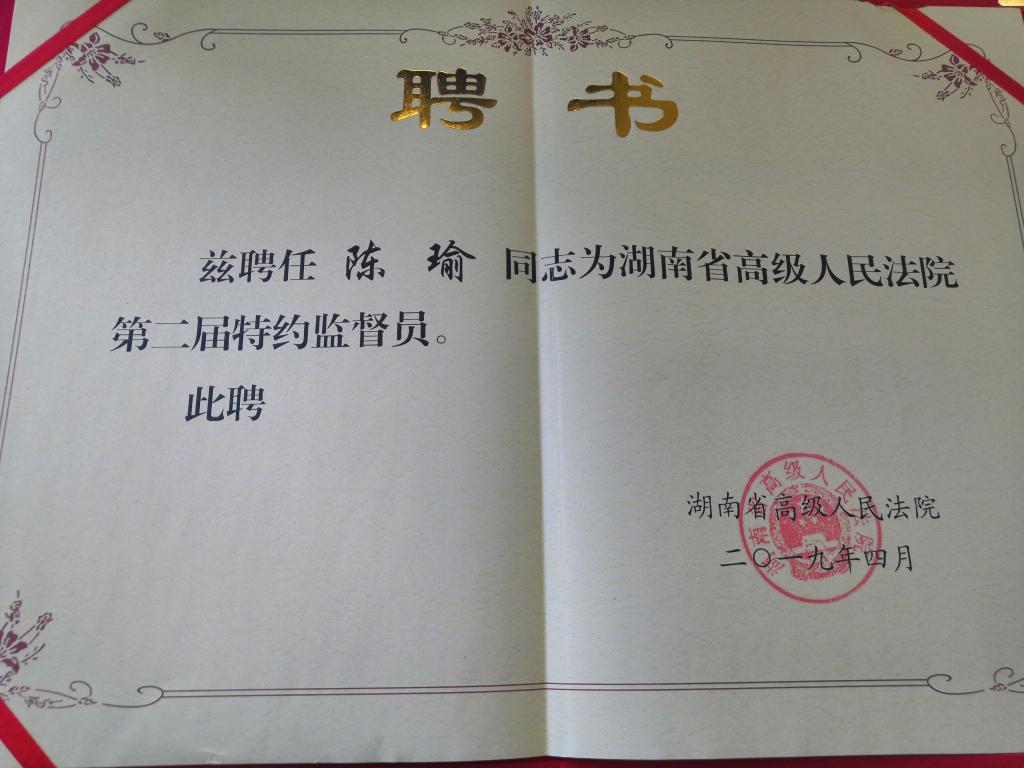 我校无党派人士陈瑜受聘为湖南省高级人民法院第二届特约监督员