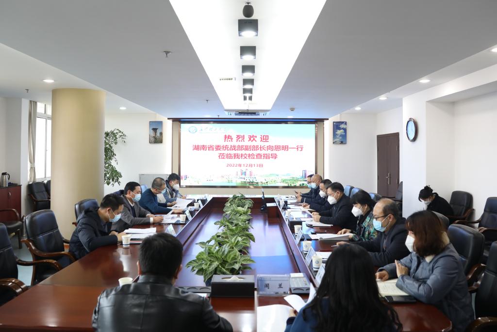 12月13日下午,湖南省委统战部副部长、省民宗委主任向恩明一行来到我校检查指导工作。省委统战部民宗处、宣传处相关同志陪同检查。校党委副书记刘建民,党委委员、副校长蒋璟萍,党政办、统战部、学工部、人事处、保卫部、研究生院、国际交流处等有关部门负责人参加。