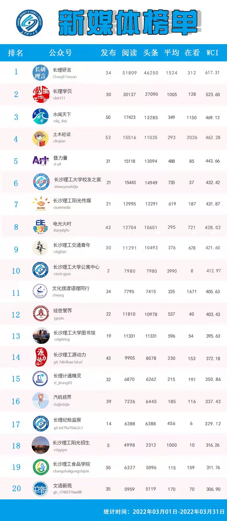 校属单位微信公众号排名(2022年3月)