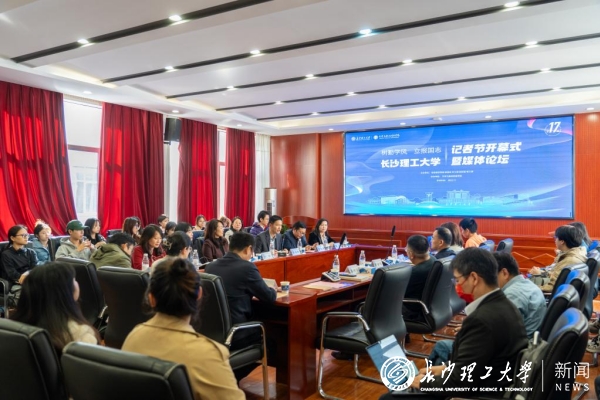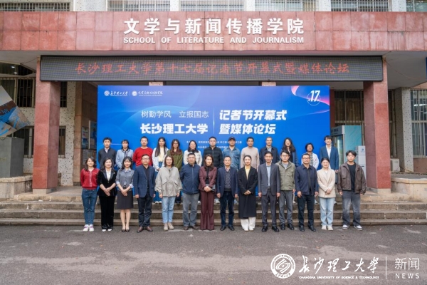 11月4日,在第26个记者节来临之际,我校于金盆岭校区九教218学术报告厅举行第十七届记者节开幕式暨媒体论坛。校党委副书记方琼,湖南广播电视台新闻中心副总监高金华、芒果超媒副总编辑易柯明、湖南日报社时政频道副总监、湘伴工作室主任邓晶琎,学校相关职能部门负责人、文新学院全体院领导和师生代表齐聚一堂,共同探讨产教融合背景下数智新闻人才的培养与创新。