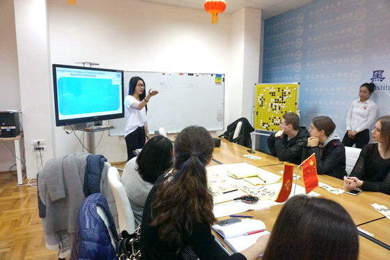 参观活动开始,中方院长邓嵘和外方院长米莱娜分别从黑大孔院建院伊始到目前的发展状况向参观学生做了介绍。随后,孔院老师们对孔院的主要项目包括奖学金、夏令营、汉语桥等活动给学生做了详细介绍。中国书法活动和剪纸也引起了参观学生的浓厚兴趣。学生们现场临摹汉字,感受中国书法的韵味和魅力。