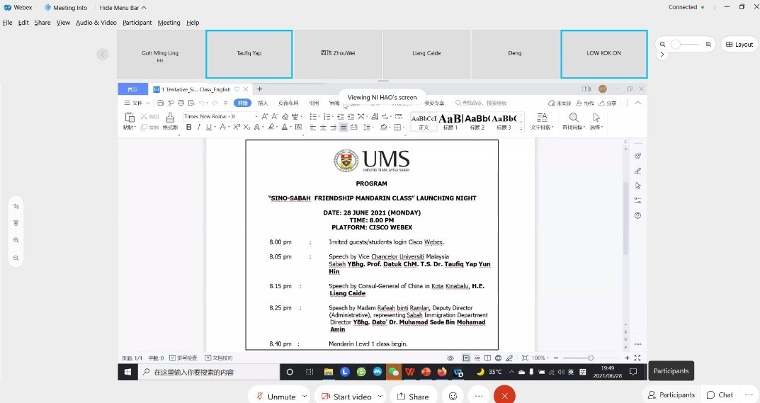 6月28日晚上8时,“中国-沙巴友谊中文班”项目在线上平台启动。中华人民共和国驻哥打基纳巴卢总领事梁才德先生、沙巴移民局总监拿督穆罕默德·萨德·本·阿明博士、马来西亚沙巴大学校长拿督陶菲克·叶永兴教授、沙巴大学副校长拉希德·梅尔教授、孔子学院工作人员,以及遍布沙巴各地的53名移民局官员参加,沙巴大学校长叶永兴教授主持启动仪式并致辞。