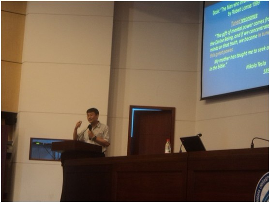 许树源教授讲座的题目是Smart Lighting Loads for future Smart Grid,许教授首先用英语向大家介绍了他的主要研究成果——无线供电技术。从许教授的详细介绍中大家了解到,无线供电早在20世纪初就已提出,而其技术瓶颈就是传输距离的增大导致传输效率下降。在许教授和他的团队的共同努力以及世界学术同行的共同推动下,攻克了这一技术难关使得传输效率大大提升。无线供电技术的应用前景非常广泛,在无人化工业生产、新能源交通以及日常用电器充电等各个领域皆可应用,并可大大降低能源成本和材料成本。许教授还向大家介绍了智能电网和LED节能灯的应用,并介绍了一种未来的新型照明系统。新一代的照明系统以其稳定、节能、寿命长等众多优点将会得到很大的推广。