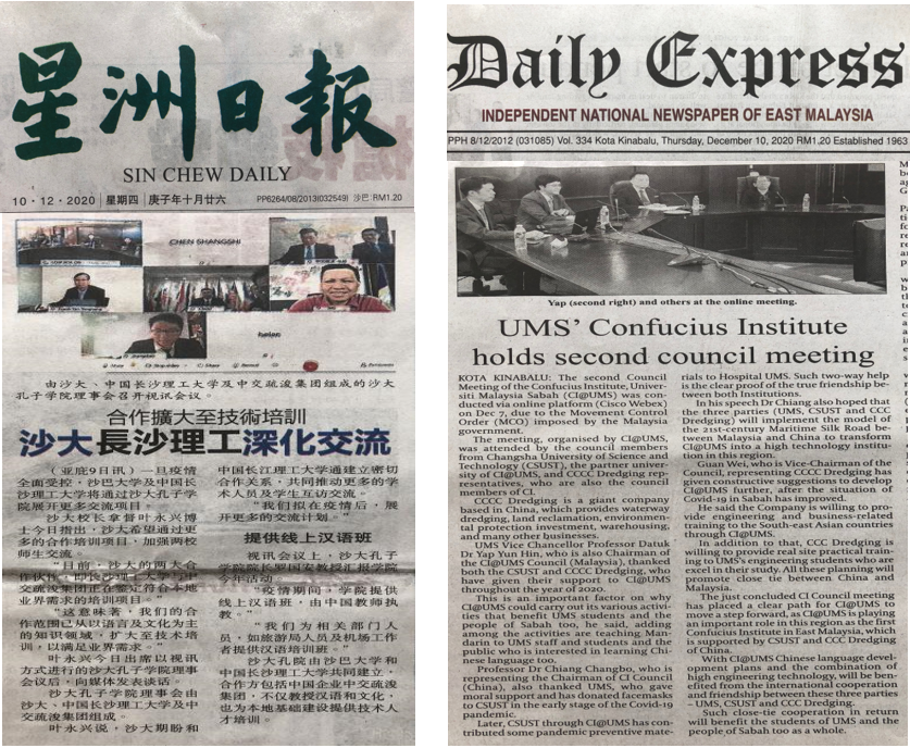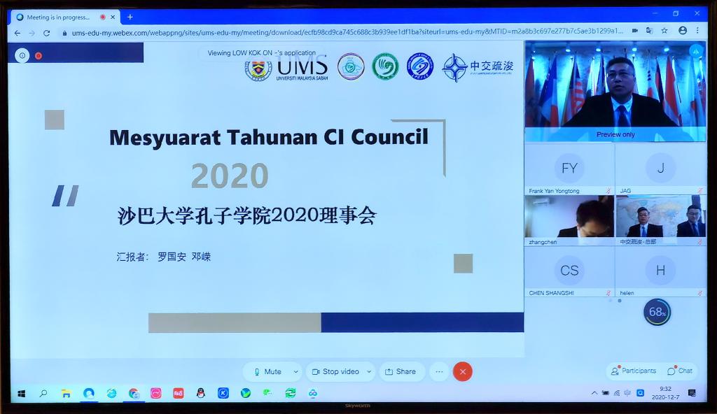 12月8日上午10点,沙巴大学孔子学院第二届理事会会议在线上举行。会议由沙巴大学孔子学院主办,我校和中交疏浚集团协办。沙巴大学校长拿督Taufiq Yap Yun Hin教授、我校副校长蒋昌波教授、中交疏浚集团副总裁关巍,孔子学院中外方院长等16名理事会成员参加会议。
