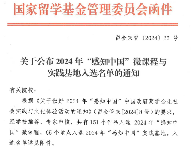 近日,国家留学基金管理委员会公布了2024年“感知中国”微课程与实践基地入选名单,我校在本次评选中取得了丰硕成果,2个微课程和1个实践基地成功入选。