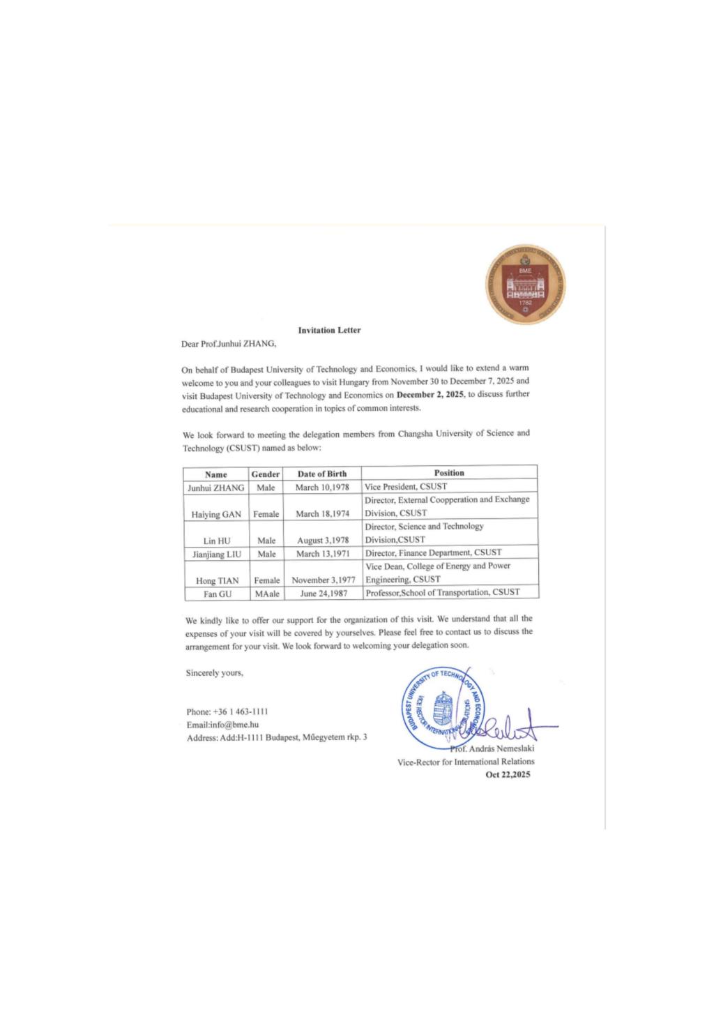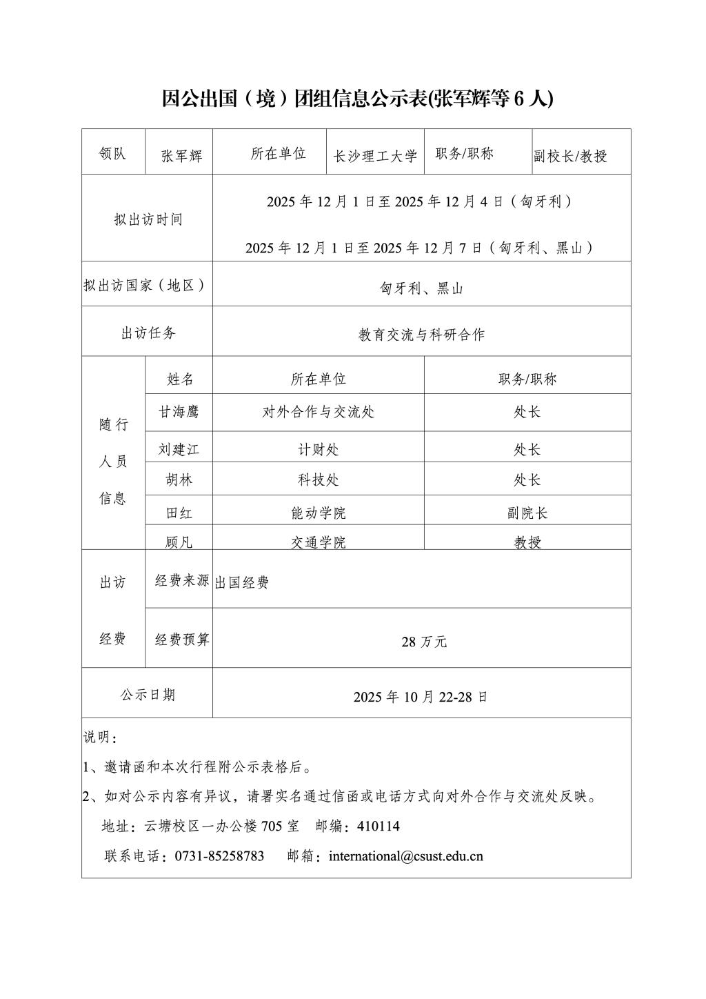 因公出国(境)团组信息公示表(张军辉等6人)