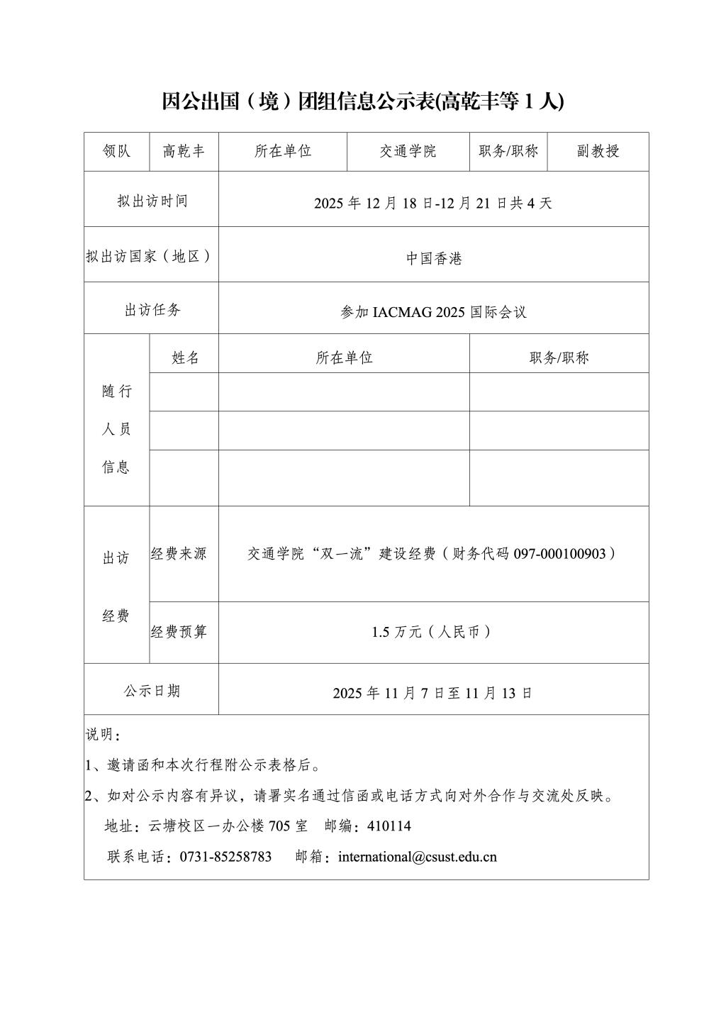 因公出国(境)团组信息公示表(高乾丰等1人)
