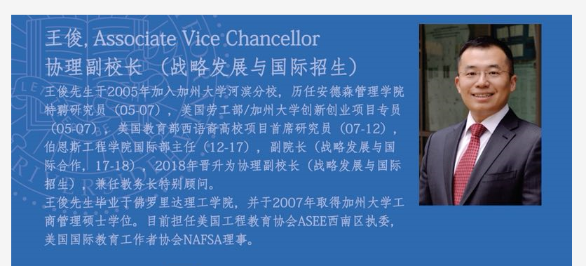 为进一步加强我校同世界主要国家间的高等教育交流,培养国际化复合型人才,鼓励并支持在校学生积极参与国(境)外学习交流,培养具有国际视野和国际竞争力的创新型人才,我校与美国加州大学河滨分校合作推出了几个出国学习交流项目(详情见公告通知栏)。近日,该校协理副校长王俊将访问我校,与对加州大学河滨分校出国学习交流项目感兴趣的同学直接会面。请有意向参加相关项目的同学准时参加。