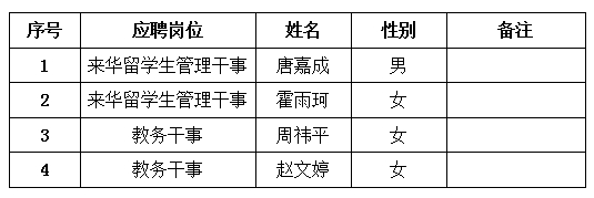 根据《国际工学院行政管理劳务派遣人员招聘公告》及有关规定,经公开报名、资格审查、面试考核、体检、招聘工作领导小组审议、党总支会研究审定,确定唐嘉成等4名同志为拟聘用人选,现予以公示。