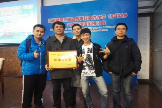 11月26-27日,湖南省第三届高等学校涉外办学(本科组)大学生英语风采比赛在湖南商学院举行,国际学院学生高添雄、李西、潘柳景泰等在领队吴振华,指导老师谷丰、易平带领下,荣获全省团体三等奖,个人一等奖、三等奖、优胜奖各1名,同时高添雄获全省个人第一名。