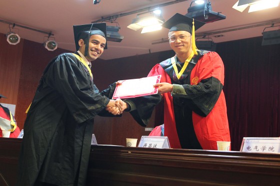 随后,国际学院党委副书记段胜峰宣读《关于表彰卡迪等优秀毕业生的决定》。副校长蒋昌波为3名优秀毕业生颁发证书。来自巴基斯坦的优秀毕业生纳蒙代表全体毕业生发言,表达了对学校和老师的感恩之情,表示将不负厚望,为增进自己祖国和中国之间的友好交流做出贡献。典礼最后,陈若玲、肖勇刚、刘志强、杨洪明为毕业生颁发学位证书并合影。