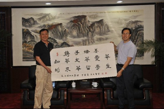 会谈后,副校长谈传生代表学校向中国路桥赠送了“携手培养知华友华爱华的来华留学生”书法作品。