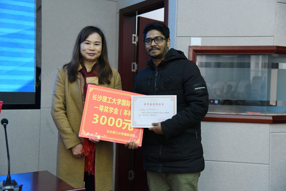 来自孟加拉国,一等奖学金获得者赛力姆同学,代表所有获得奖学金的国际学生发言。他满怀真挚的情感,感谢有来到中国学习的机会,并且在老师和同学们的帮助下,在大学里收获了累累果实。发言结束后,23名获奖学生依次上台领奖,同时接受全体老师和同学们的祝贺。