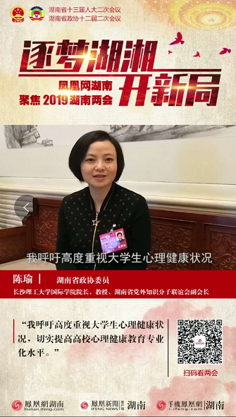 近日,湖南省政协委员、湖南省党外知识分子联谊会副会长、我校国际学院院长陈瑜教授在湖南省“两会”期间接受了凤凰网的专访。陈瑜通过深入调研,阐述了当前我省大学生心理健康教育的基本现状,介绍了我校心理健康教育工作的基本经验,提出了进一步提升大学生心理健康水平的系列建议。她呼吁,政府、社会和高校要高度重视大学生心理健康状况,切实提高高校心理健康教育专业化水平。据悉,陈瑜教授代表教育届政协委员在联组会议上发言时提出了上述建议,获得了省领导和教育厅领导的肯定的关注。(文/陈竹 审/成华)