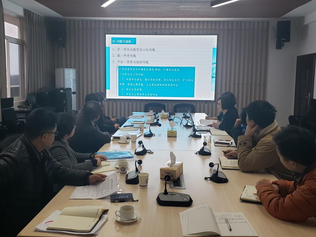 会前,洪源渤会长、黎正稳副会长参观了学院办公区间,对国际化的办公及外事接待环境给予了肯定。会上,付嫦娥对提议并促成本次校友会调研的领导及工作人员致谢,此举意味着对我校国际校友工作的重视和依托我院组织、开展本校国际校友活动的充分信赖。陈瑜接下来简要介绍了学院成立三年以来的长足发展,详细介绍了校友工作的开展情况,提出与校友会对接,希望在深化校企合作、拓展培训业务、争取优秀校友及企业赞助,成立学生奖助学基金三方面发力,进一步推进校友工作往实处、往深层发展。