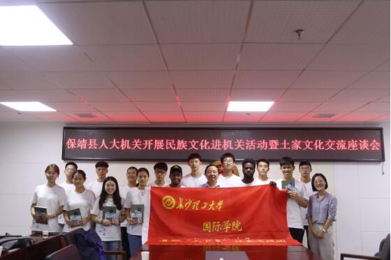 在座谈会上,向主任用土家语“mo cuo zi, sei ni ca!”问候了调研团成员,意为:“朋友们,你们好!”。会上,了解到土家语很多都是倒装句,跟英语相似。随后,向主任从服饰、风俗、建筑、婚俗四个方面介绍了土家族的文化特色、历史变迁,并耐心地对调研团答疑解惑。来国际学生Mario和Laelson也提出了他们对于不同文化观点,与向主任进行了探讨。会后,向主任为实践团每位成员每人赠送了一本《保靖县土家语实录》,并拍照留念。Mario和Laelson还主动提出和向主任单独合影留念,记录下感受土家文化不一样的时刻。