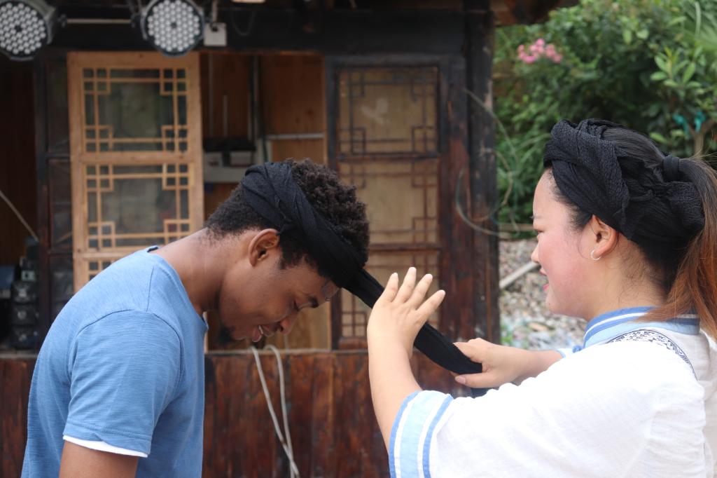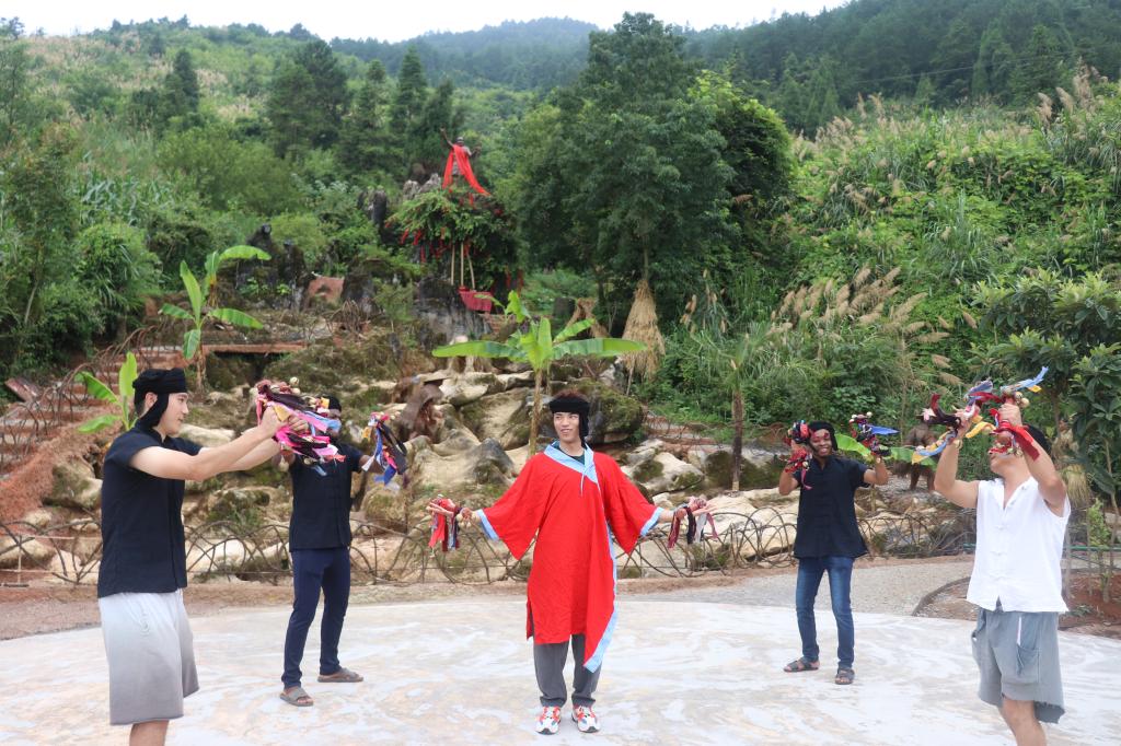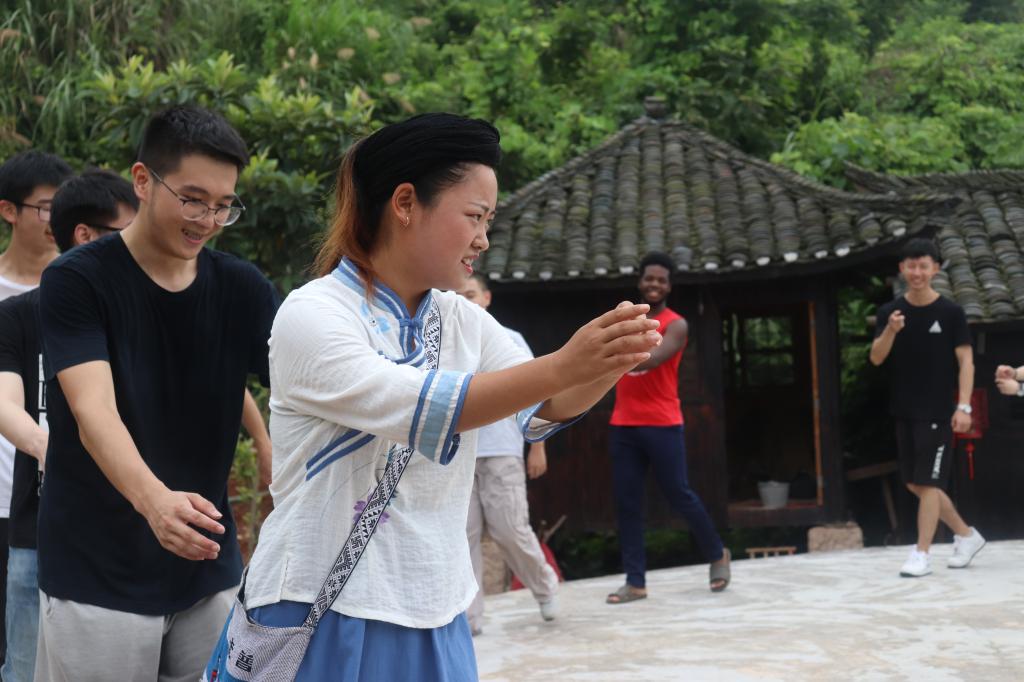 天开文运土家山庄是一家以弘扬土家文化为宗旨的农家场所。山庄积极响应“美丽湘西”建设战略,努力发展乡村旅游,带动村民脱贫致富,在绿色文化生态旅游业中独具品味,是保靖县对外展示土家文化的一张名片。山庄里陈列着土家族日常生活用具、民间工艺用具、民族乐器用具等器具,生动地反映出土家人在历史长河中积累起来的智慧。参观完陈列的物品,队员们在土家阿姐热情地邀请下试穿了土家族传统服饰,学习到土家族头帕系法,加深了对土家族服饰文化的理解。随后,土家阿姐还教队员们跳起了“摆手舞”。“摆手舞”是土家族的传统舞蹈,分为大摆手和小摆手两种。它起源于宗教祭祀活动,反映了土家族人的生产生活,是研究土家族十分重要的素材。