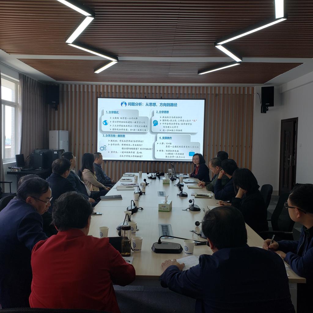 书记刘安生代表学院致欢迎辞,简要介绍了学院人员构成情况和会前准备情况。院长陈瑜围绕国际化办学工作现状、问题分析、未来规划和建议做工作报告,从办学规模、办学质量等方面介绍了学院的发展情况;从办学模式、办学思想、办学方向和支撑条件等方面进行了重点问题分析;从教改班工作、中外合作办学、来华留学生工作等方面阐述了实现学院高质量发展的六项重点工作;从人事、财务等掣肘学院发展的重点问题方面提出了五点建议。与会人员现场就相关问题进行了充分的交流。