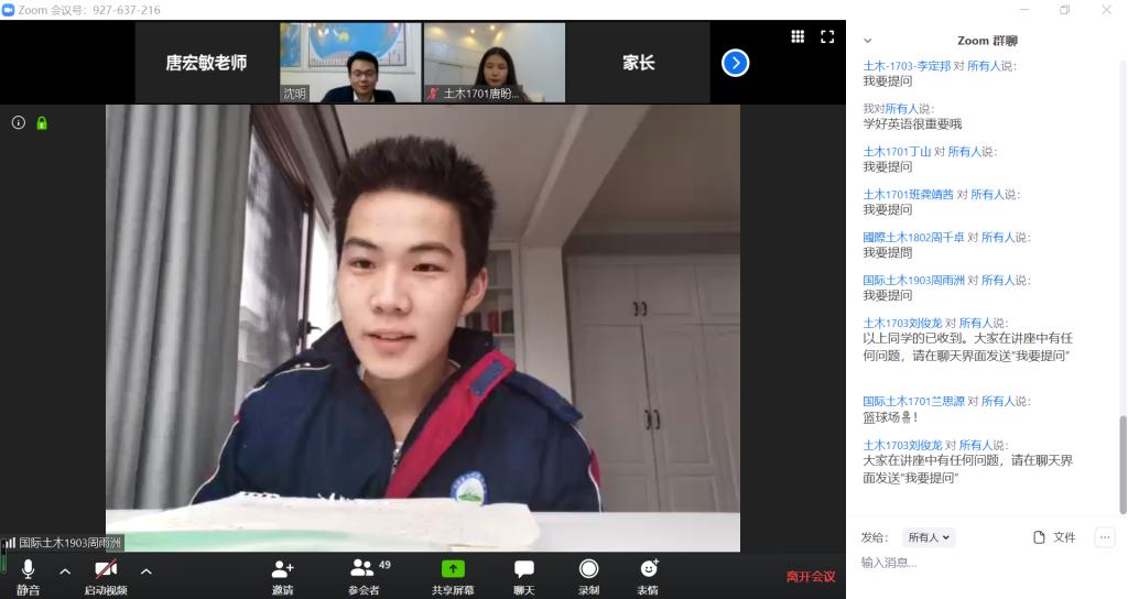 沈明以“勇担使命,实现梦想——关于“一带一路”倡议背景下国际化土木工程人才走出去的交流”为题,从为什么“走出去”、怎样“走出去”、“走出去”需要什么样的人才三方面讲述了我国海外土木工程项目发展现状和趋势,大型企业对国际化土木工程专业人才的需求,并对在校土木工程专业大学生的学习提出建议,叮嘱同学们在疫情防控期间不要放松学习,珍惜学习时光。最后,他还在线耐心地回答了同学们的提问,与同学们进行了深入的交流与互动。