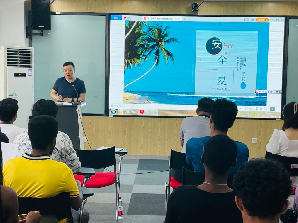 首先,张雅雯结合《中华人民共和国出境入境管理法》为学生讲解了暑假期间在华合法居留的注意事项,督促学生在华遵纪守法,遵守校规校纪。接着,王荟惠结合留学生日常生活学习实例讲解了防电信网络诈骗、防“校园贷”陷阱、防陷入传销组织、防性骚扰和性侵害、消防安全、防疾病防运动伤害、防食品安全隐患危害、防实验实训实习安全事故、防交通安全事故、防危房坍塌危害、防溺水、防新冠肺炎病毒感染、防范非法集资等应知应会的安全教育常识,督促在校留学生养成良好生活习惯,合理安排假期,努力学习,坚持“非必要不离校”“非必要不离长”,做好个人健康监测和请销假,切实保护自身安全。最后,乔法光叮嘱学生要遵守假期管理的各项规定,度过一个安心舒心的暑假。