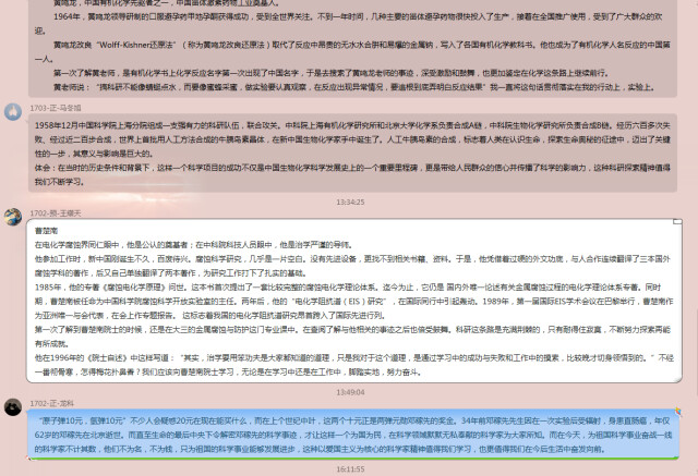 学生党员还结合专业特色开展“四史”学习,注重挖掘新中国发展史中原子弹制造等化学科技发展史。党员们线上讨论分享了解到的原子弹制造史、化学科技发展史,通过了解邓稼先等人突破苏联的技术封锁,从无到有,最后实现了第一颗原子弹爆炸成功。应化支部龙科说,“通过这些知识的梳理,更近明白了新中国来之不易、如今的幸福生活来之不易,也更加坚定自己努力学习专业知识努力为我国科研事业做奉献的决心”。