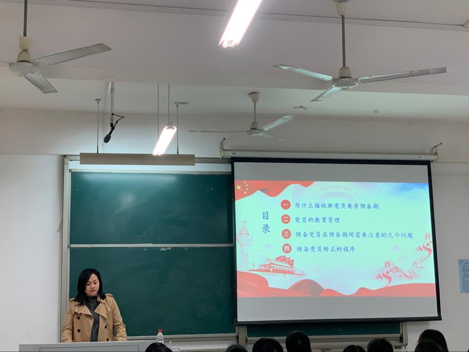 11月11日晚19:00,化学学院与外国语学院第二十二期预备党员培训班于文科楼A301联合开展第二次党课,由校党委组织部干部科李芳瑾老师授课,主题为《预备党员如何度过预备期》。