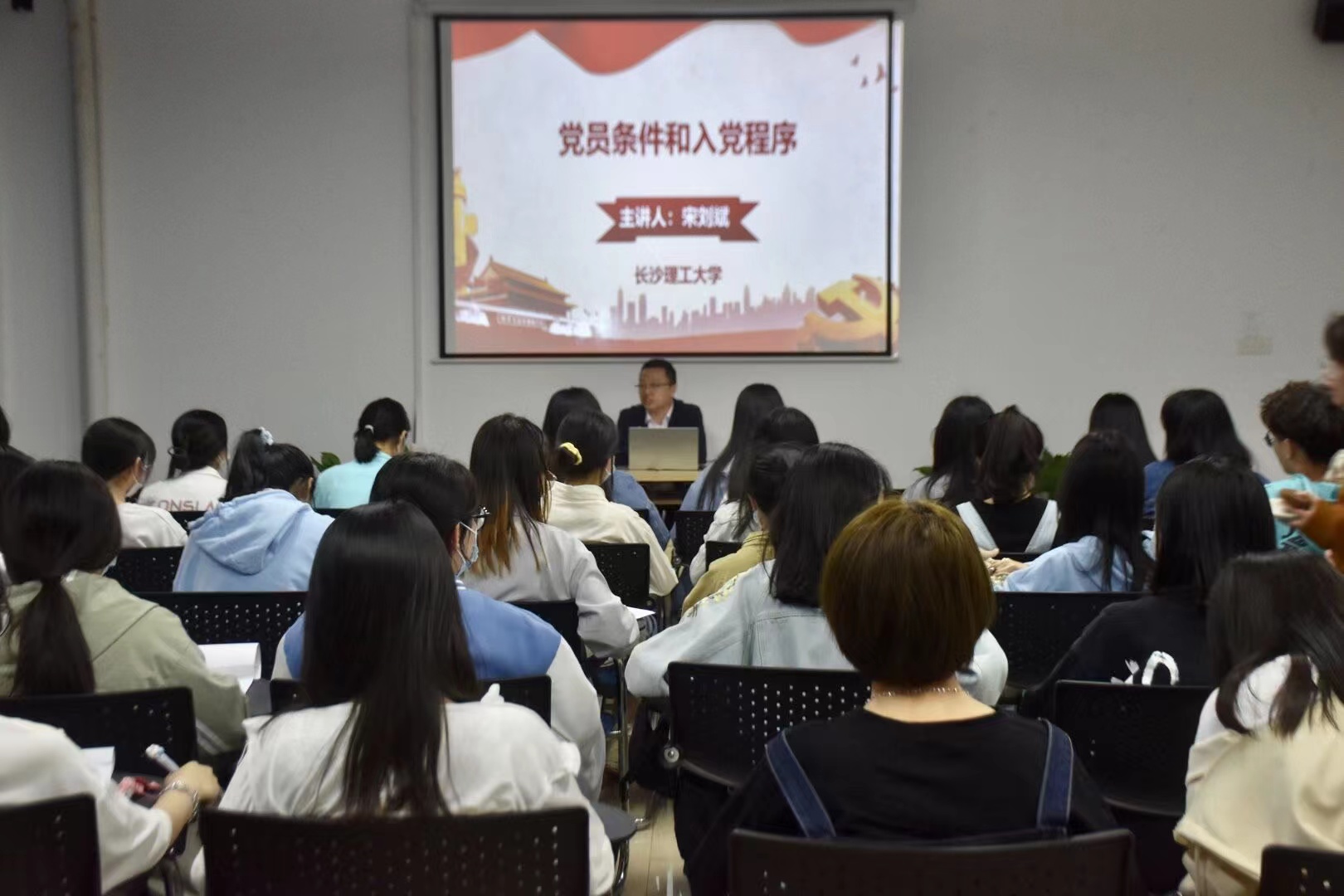 为加强入党积极分子对党的认识,提高党性修养。2022年4月21日19时,化学化工学院、文新学院和法学院于工三B210联合开展云塘校区第39期入党积极分子培训班第三次党课——《党员条件与入党程序》。本次党课由“全国脱贫攻坚先进个人”、化学化工学院党委书记宋刘斌主讲,化学化工学院、文新学院和法学院58名学员参加。
